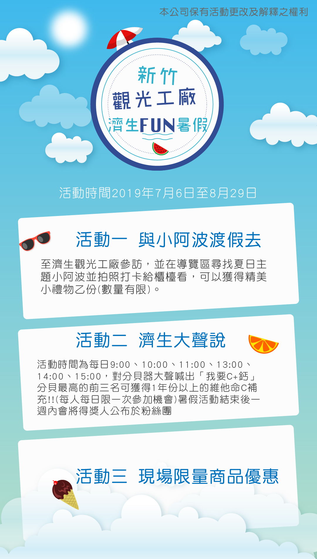活動期間小朋友至濟生觀光工廠參訪,並在導覽區尋找夏日主題小阿波並拍照打卡給櫃檯看,可以獲得精美小禮物乙份(數量有限)。