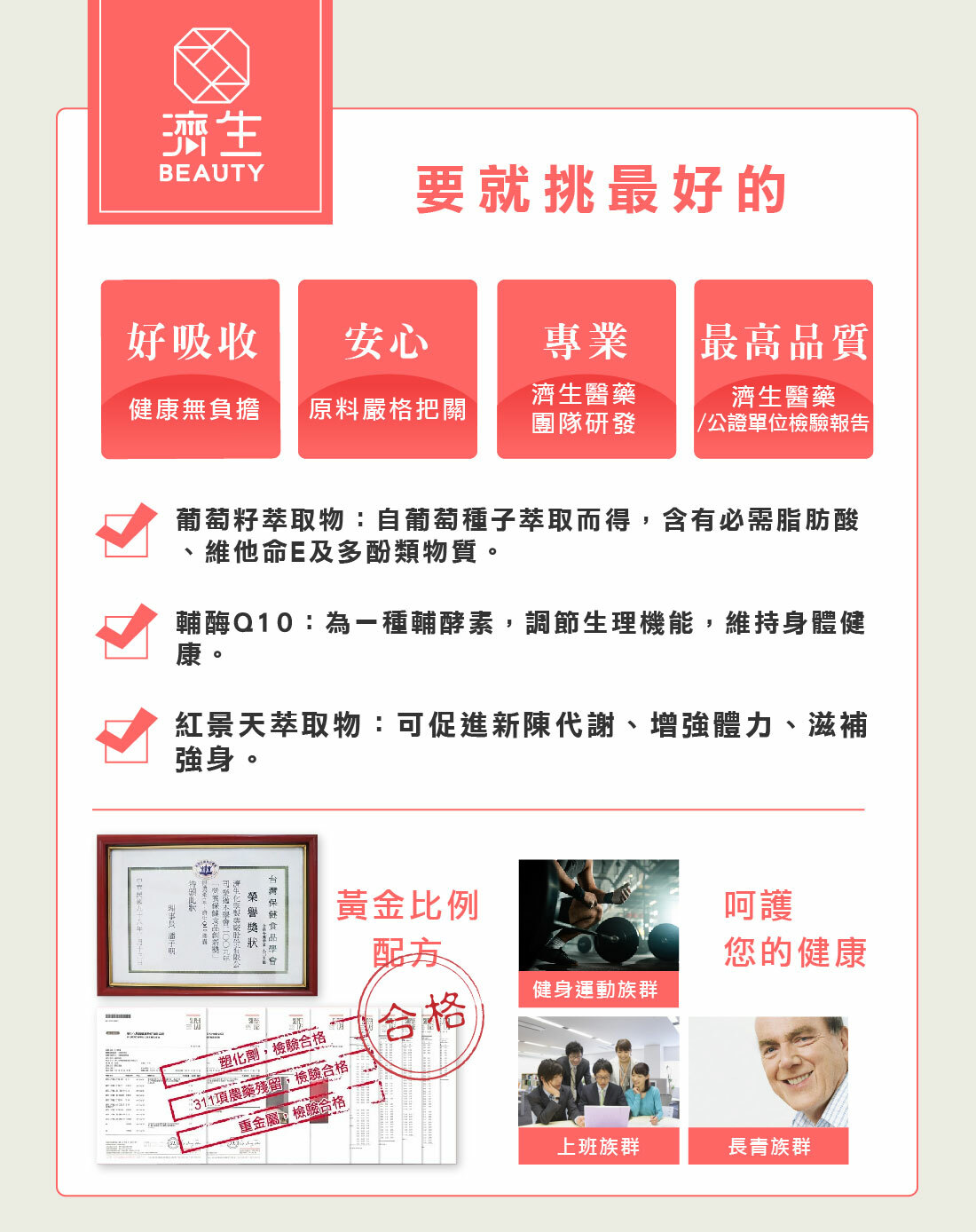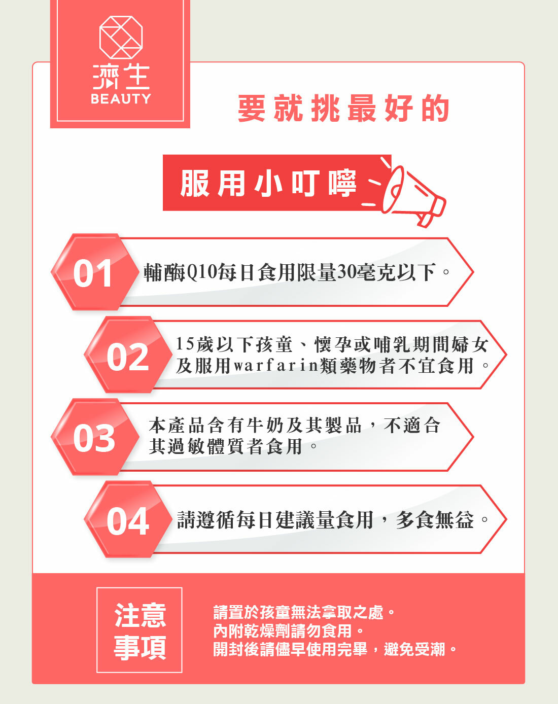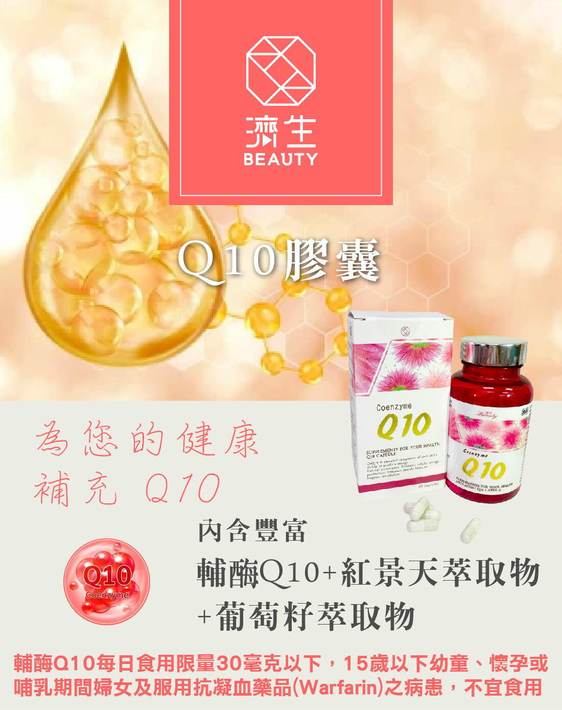 5. 輔酶Q10每日食用限量30毫克以下,15歲以下小孩、懷孕或哺乳婦女及服用抗凝血藥品(warfarin)之病患,不宜食用