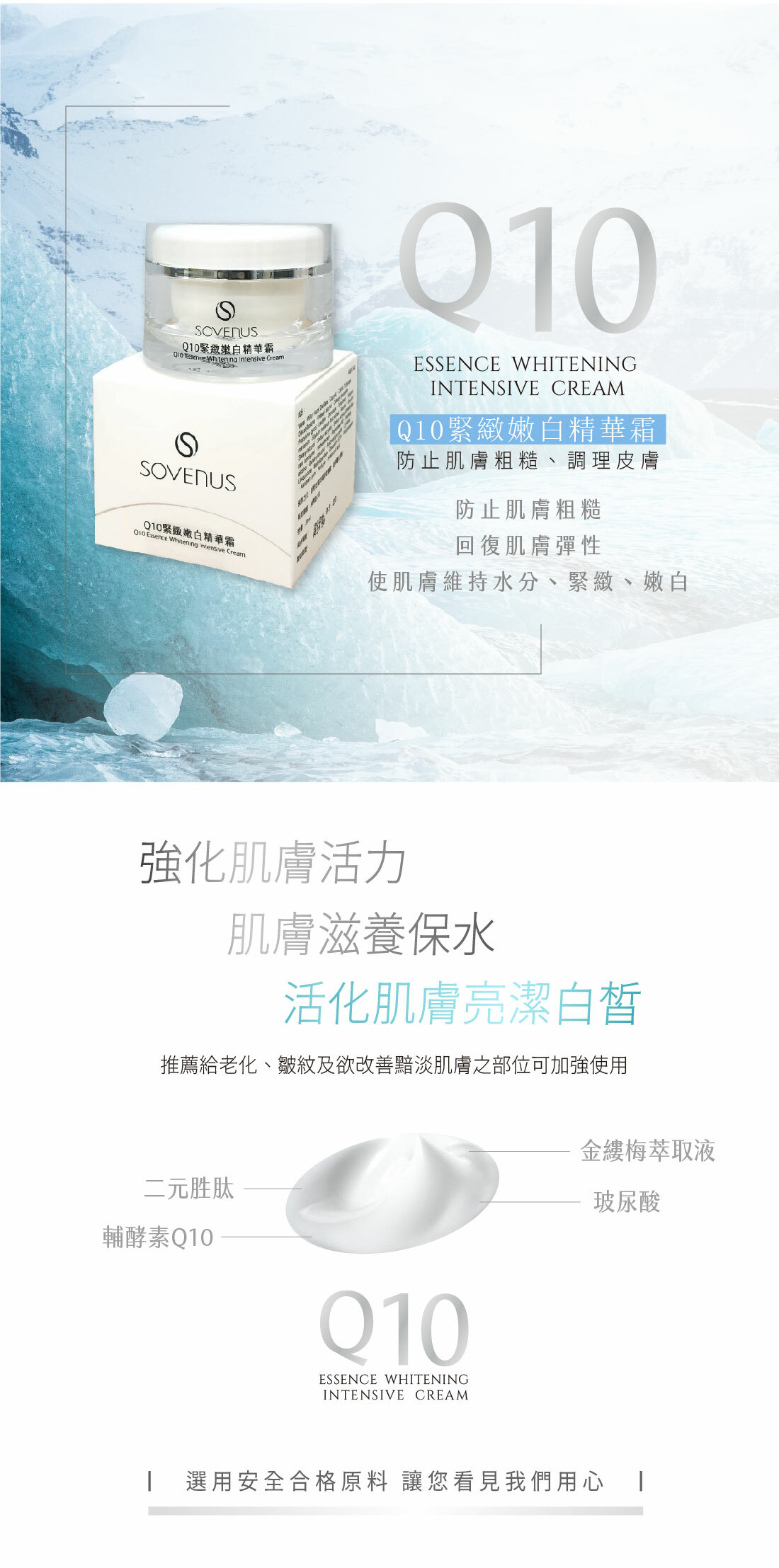 Q10緊緻嫩白精華內含輔酵素Q10、玻尿酸、金縷梅萃取液、Diacetylboldine,可強化肌膚活力、肌膚滋養保水、舒緩細紋、活化肌膚亮潔白晰。